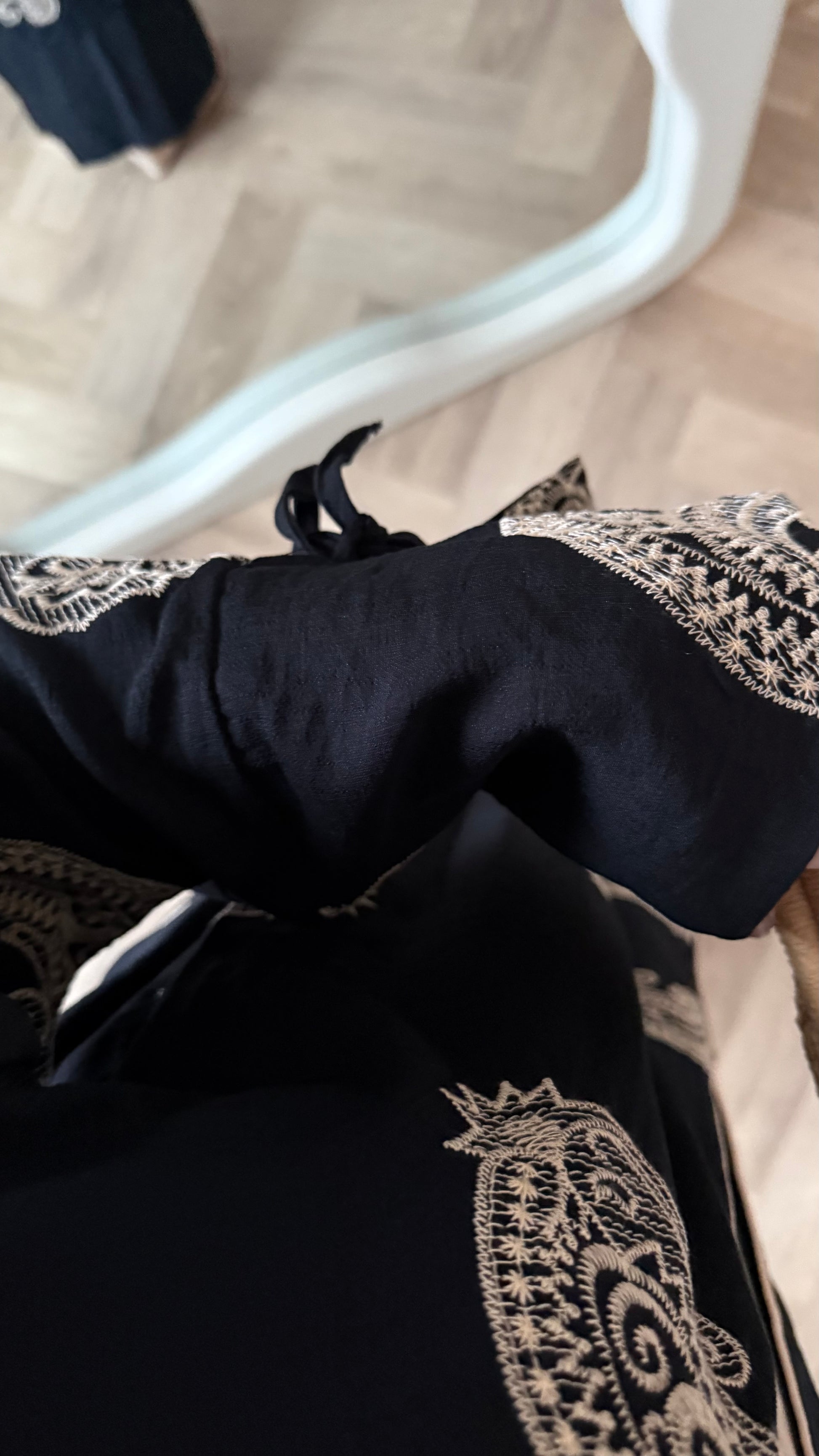 A timeless three-piece ensemble that exudes quiet sophistication. This set features a flowing open-front black abaya adorned with intricate beige paisley embroidery, layered over a soft champagne-toned inner top and matching wide-leg black trousers. The delicate sleeve ties and subtle gold accessories add a refined touch. Perfectly styled with nude heels and a woven clutch, this look merges tradition with modern elegance, ideal for both formal gatherings and everyday grace.