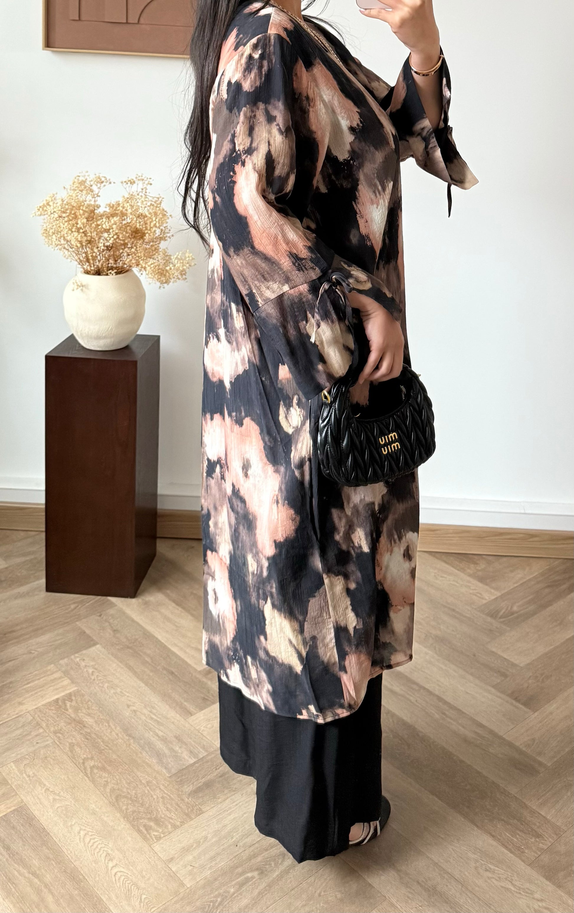 An effortlessly elegant three-piece black set designed for both comfort and sophistication. The ensemble features tailored wide-leg trousers and a sleek, minimal inner top, creating a polished base. Draped over it is a vibrant, multicoloured kimono that adds a touch of artistic charm and fluidity. Perfect for day-to-night transitions, this look is a beautiful blend of understated style and bold expression.