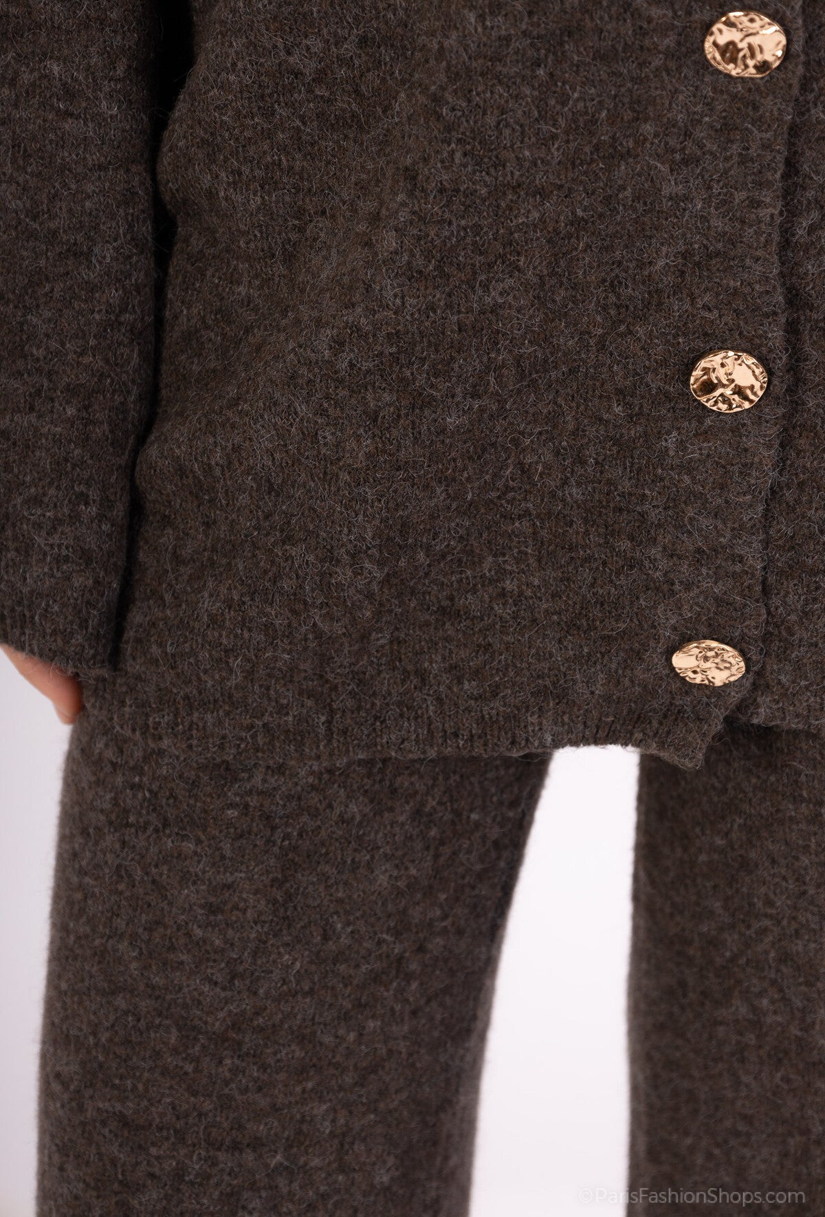 It’s a relaxed, oversized button-down knit top paired with wide-leg knit pants — perfect for casual, comfy, and minimalist styling.
